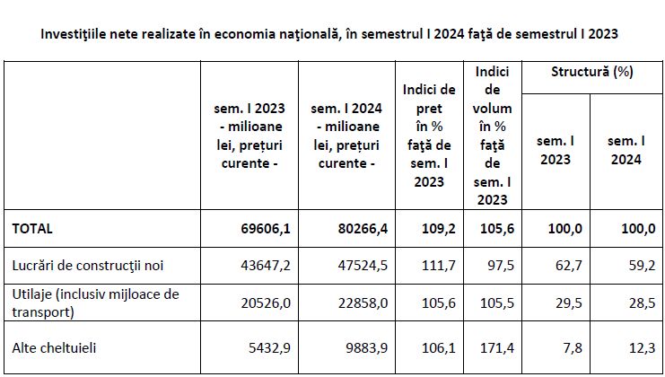 In semestrul I al anului 2024, investitiile nete realizate in economia nationala au insumat 80,26 miliarde lei, in crestere cu 5,6%, comparativ cu perioada corespunzatoare din 2023, potrivit datelor Institutului National de Statistica (INS). Cresteri au fost inregistrate, pe elemente de structura, pe indicatorul "alte cheltuieli" (+71,4%) si la utilaje (inclusiv mijloace de transport), cu 5,5%. Investitiile nete in lucrari de constructii noi au scazut cu 2,5%, in primul semestru.Pentru trimestrul al doilea al acestui an, datele INS indica investitii nete totale in economie de 45,75 miliarde lei, in crestere cu 5% comparativ cu cele trei luni corespunzatoare ale anului 2023. Evolutia a fost inregistrata la toate elementele de structura: utilaje (inclusiv mijloace de transport) cu 12%, la alte cheltuieli de investitii cu 4,4% si la lucrarile de constructii noi cu 2%.