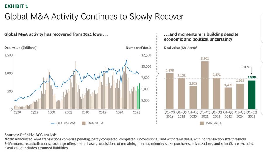 Dupa un inceput de an dificil, piata globala de fuziuni si achizitii (M&A) isi recapata avantul. In primele noua luni ale anului 2025, valoarea globala a tranzactiilor a crescut cu 10%, pana la 1,9 trilioane de dolari, comparativ cu aceeasi perioada a anului trecut.Aceasta revenire nu este inca sustinuta de un optimism generalizat, ci mai degraba de un grup select de cumparatori experimentati, care fac achizitii strategice, intr-un context de volatilitate a pietelor. Concluziile apar in cea de-a 22-a editie a Raportului anual Global M&A realizat de Boston Consulting Group (BCG).