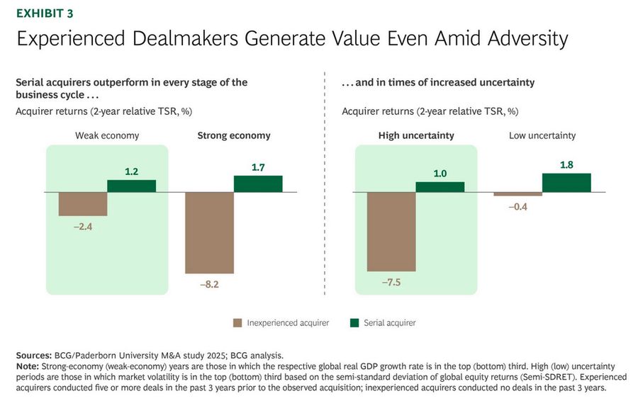 Indiferent de dimensiunea tranzactiei, sector sau regiune, rTSR-ul pe doi ani al tranzactiilor M&A scade in perioadele de incertitudine (mediana fiind de -0,4%). In acest context, se contureaza un tipar clar: companiile cu experienta solida si institutionalizata in M&A obtin rezultate superioare.