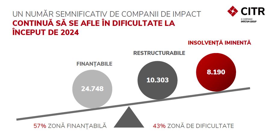 CITR, liderul pietei de insolventa si restructurare din Romania, anunta ca numarul companiilor de impact aflate in insolventa iminenta creste cu 18%, de la 6.949 la 8.190, iar cel al companiilor de impact aflate in dificultate atinge cel mai inalt nivel din 2013 pana in prezent. Studiul a fost realizat pe baza celor mai actuale date financiare oficiale, raportat la situatia financiara a companiilor la inceputul anului 2024. "Cifrele analizate reprezinta o radiografie relevanta pentru a intelege mediul de afaceri din Romania. Nu vorbim despre o criza sau un factor extern care a perturbat activitatea companiilor in 2023, vorbim de o lipsa acuta de performanta, multianuala si relevanta statistic, materializata in rezultate slabe si indicatori sub nivelul optim. Concluzia este ca ne aflam intr-un punct esential, in care toate aceste companii trebuie sa adopte masuri de adaptare si consolidare, pentru a putea continua pe termen lung si a avea capacitatea de a raspunde unor provocari noi", a declarat Paul-Dieter Cirlanaru, CEO CITR.