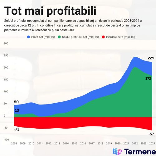 Un studiu amplu realizat de Termene.ro pe baza datelor financiare oficiale din perioada 2008-2024 arata transformarea profunda prin care a trecut mediul de afaceri din Romania in ultimul deceniu si jumatate. Cifra de afaceri cumulata a crescut de peste trei ori (de la 857 la 2.677 miliarde lei), profiturile nete s-au multiplicat de 4,5 ori (la 229 miliarde lei), iar raportul dintre profituri si pierderi a ajuns la un nivel record: peste 4 lei profit pentru fiecare 1 leu pierdere.Perioda analizata reflecta cea mai consistenta perioada de transformare din istoria businessului romanesc. De la criza financiara globala, trecand prin pandemie si pana la inflatia accelerata din ultimii ani, companiile romanesti au traversat perioade de ajustari rapide, urmate de consolidare si crestere accelerata - iesind din fiecare criza mai puternice decat au intrat.