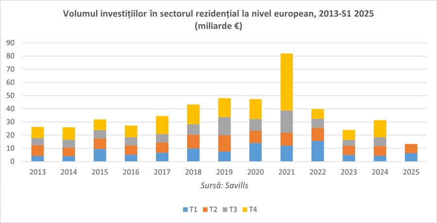 Volumul investitional in sectorul rezidential european a atins nivelul de 13,3 miliarde de euro in S1 2025, in crestere cu 15% fata de rezultatul din perioada similara din 2024 si reprezentand 13% din totalul investitiilor imobiliare derulate in prima jumatate a acestui an, potrivit datelor Savills, unul dintre liderii mondiali in consultanta imobiliara. "Romania se afla deocamdata spre coada clasamentului destinatiilor preferate de investitorii institutionali in segmentul rezidential, insa acest lucru ar putea sa se schimbe pe termen mediu si lung”, a declarat Oana Popescu, Partner, Head of Residential in cadrul Crosspoint Real Estate, Asociat International al Savills in Romania si companie care sarbatoreste in 2025 doua decenii de activitate pe piata imobiliara. „Lipsa unei legislatii dedicate, de natura sa stimuleze fondurile de investitii sa se indrepte spre Romania, este unul dintre motive, dar nu cel mai important. Orientarea puternica a romanilor catre a fi mai degraba proprietari decat chiriasi, inexistenta unui stoc relevant de produse specifice si fundamentele macroeconomice actuale sunt aspecte care tin inca pe loc acest segment”, a adaugat Oana Popescu.