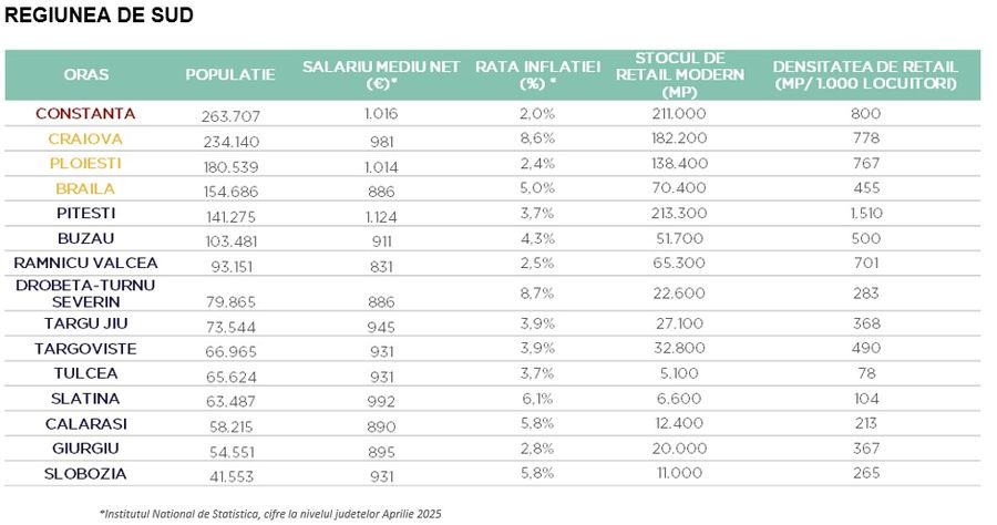 La nivel de oras, localitatile cu cea mai mare densitate de spatii comerciale sunt Pitesti (1.510 mp/ 1.000 locuitori), Suceava (1.471 mp/ 1.000 locuitori), Deva (1.252 mp/ 1.000 locuitori), Sibiu (1.213 mp/ 1.000 locuitori), Oradea (1.123 mp/ 1.000 locuitori) - orase cu pana la 150.000 de locuitori si Timisoara (1.089 mp/ 1.000 de locuitori) - oras primar cu o populatie de peste 250.000 de locuitori.