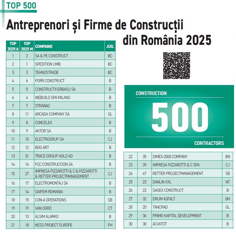 Primele zece companii de constructii din Romania au realizat, in 2024, afaceri totale de circa 5,3 miliarde euro, reprezentand 8% din volumul total al lucrarilor de constructii estimat pentru anul trecut la peste 65 miliarde euro, potrivit datelor din piata. Cifra de afaceri totala a celor mai mari 500 de companii de constructii active in Romania, conform TOP 500 Antreprenori si Firme de Constructii din Romania - editia 2025 a ajuns la 19,8 miliarde euro in 2024 (+46,5%). Si in 2024, firmele interne si internationale si-au "impartit" primele zece pozitii ale clasamentului. Foarte important de precizat este faptul ca cele trei firme romanesti care ocupa din nou podiumul (Spedition UMB, SA&PE si Tehnostrade) fac parte din acelasi grup, fiind detinute de omul de afaceri Dorel Umbrarescu. Notabila este si o noua intrare in Top 10, a companiei Arcada Company SA, care inclina usor balanta in directia companiilor romanesti din clasament (6 firme cu capital romanesc si 4 straine). Cele mai mari cifre de afaceri au fost realizate de antreprenorii de constructii care au participat la executia de lucrari de infrastructura de transport, generand venituri substantiale pentru majoritatea companiilor din Top 10.Potrivit datelor Comisiei Nationale de Strategie si Prognoza (CNSP), volumul lucrarilor de constructii ingineresti a avansat cu peste 30% in perioada 2023-2024, acesta urmand a ramane motorul sectorului de constructii cel putin pana in 2027, chiar daca dinamica de crestere se va tempera.