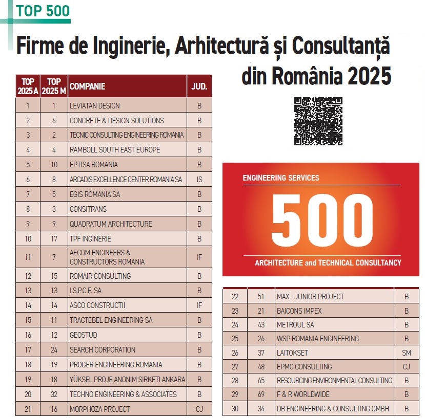Conform calculelor medii realizate pentru ultimii trei ani fiscali incheiati (2022-2024), primele zece companii de inginerie, arhitectura si proiectare, cu afaceri de 179,2 milioane de euro, reprezinta 20% din piata celor 500 de societati incluse in analiza. Primii 100 de proiectanti reprezinta circa 58% din total, realizand o cifra de afaceri cumulata medie de 527 milioane de euro, in timp ce primii 500 de proiectanti, care reprezinta toate societatile incluse in Top 500, au realizat, in medie, in 2022-2024, afaceri totale de 906,7 milioane de euro. In ultimii ani, cea mai dinamica companie din domeniu a fost Leviatan Design, care a urcat pe prima pozitie in 2023, in 2024 consolidandu-si pozitia in top. Dupa o crestere de 551% in 2023, fata de nivelul din 2022, compania si-a mentinut trendul crescator si in 2024, cand a raportat o majorare de 33% a rulajului in raport cu anul anterior, pana la 395 milioane de lei. Aceasta performanta este notabila, avand in vedere ca intregul sector de arhitectura si proiectare a inregistrat o crestere de 13,4% in 2024 raportat la 2023, conform Institutului National de Statistica (INS). Printre marile proiecte la care compania a participat in 2024 si 2025 se afla parcarea pentru aeronave de mari dimensiuni in Baza 86 Aeriana Borcea, consolidarea cladirilor cu risc seismic din Bucuresti si Baza 57 Aeriana "Mihail Kogalniceanu", dezvoltarea infrastructurii statice a Comandamentului Corpului Multinational de Sud-Est si a unui pavilion NOC (Network Operations Centre) si CSOC (Cyber Security Operation Centre) in Sibiu etc. Pe parcursul anului 2025, grupul Leviatan a contractat mai multe proiecte importante din sfera apararii, precum si din domeniul medical, prin includerea proiectului privind proiectarea si executia noului Spital Clinic de Pneumoftiziologie si Boli Infectioase din Brasov. La evolutia importanta a companiei a contribuit orientarea puternica a acesteia catre digitalizare, in cadrul firmei fiind implementat BIM in toate procesele de lucru.