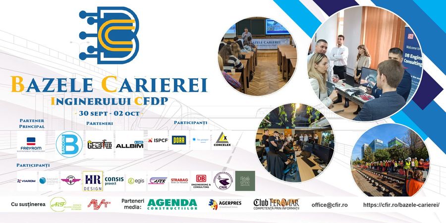 Evenimentul este realizat cu sprijinul partenerilor CFiR: Alvirom, Baicons, Concelex, Electromontaj, E-P Rail, Forester, ISAF, Interregional Calatori, ISPCF, Knorr-Bremse, Novatex, PORR Romania, Proiect Consult, Tim Rail Cargo, TPF Inginerie, Consis Proiect, DB Cargo Romania, DB Engineering & Consulting, Egis Romania, Hiarom Invest, Novatech si STRABAG Romania, dar si al institutiilor de invatamant si asociatiilor profesionale si patronale cu care colaboram: UTCB - Facultatea de Cai Ferate, Drumuri si Poduri, Universitatea Transilvania din Brasov, UNSTPB - Facultatea de Transporturi, Universitatea Politehnica Timisoara - Facultatea de Mecanica, Universitatea Valahia din Targoviste, Universitatea Nationala de Stiinta si Tehnologie POLITEHNICA Bucuresti - Centrul universitar Pitesti, Universitatea Ovidius Constanta, Universitatea din Oradea, Universitatea Tehnica Cluj-Napoca, Colegiul Tehnic Feroviar "Mihai I" Bucuresti, CENAFER, Universitatea din Craiova, Asociatia Industriei Feroviare - AIF, Asociatia Inginerilor Feroviari - AIFR, Eurodeal - formare profesionala, AMOFM Bucuresti, AJOFM Ilfov, OPSFPR.