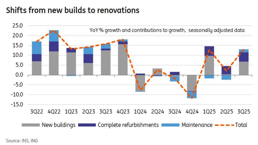 Sectorul rezidential, desi s-a stabilizat, ramane fragil: dupa o prabusire de 21,4% in 2024, activitatea a crescut cu aproape 10% in perioada ianuarie - septembrie 2025. Totusi, aceasta evolutie provine, probabil, in mare parte din finalizarea proiectelor restante. Rapoartele de piata indica o scadere de circa 5% a lucrarilor finalizate in prima jumatate a anului 2025, iar desi eliberarea de autorizatii s-a stabilizat, portofoliul pentru noi proiecte rezidentiale mari pare destul de subtire.