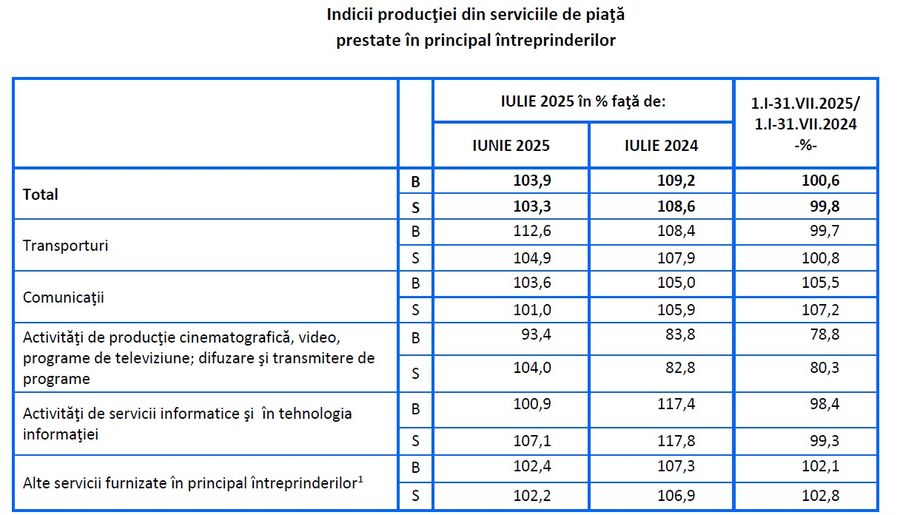 In luna iulie 2025 comparativ cu iulie 2024, cifra de afaceri din serviciile de piata prestate in principal intreprinderilor, serie bruta, a crescut, pe ansamblu, cu 9,2%, datorita majorarii rulajului din activitatile de servicii informatice si in tehnologia informatiei (+17,4%), de transporturi (+8,4%), alte servicii furnizate in principal intreprinderilor (+7,3%) si din activitatile de comunicatii (+5%). Activitatile de productie cinematografica, video, programe de televiziune; difuzare si transmitere de programe au scazut cu 16,2%. Ca serie ajustata, cifra de afaceri din serviciile de piata prestate in principal intreprinderilor a crescut, in aceeasi perioada de raportare, pe ansamblu, cu 8,6%.