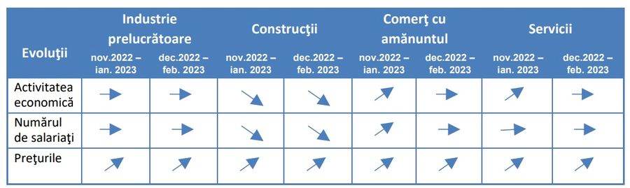 Conform estimarilor din luna decembrie 2022, cererea de servicii (cifra de afaceri) va inregistra relativa stabilitate in urmatoarele trei luni (sold conjunctural -3%). Se estimeaza relativa stabilitate si in cazul numarului de salariati (sold conjunctural -2%). Conform opiniei managerilor, preturile de vanzare sau de facturare ale prestatiilor vor avea tendinta de crestere (sold conjunctural +24%).