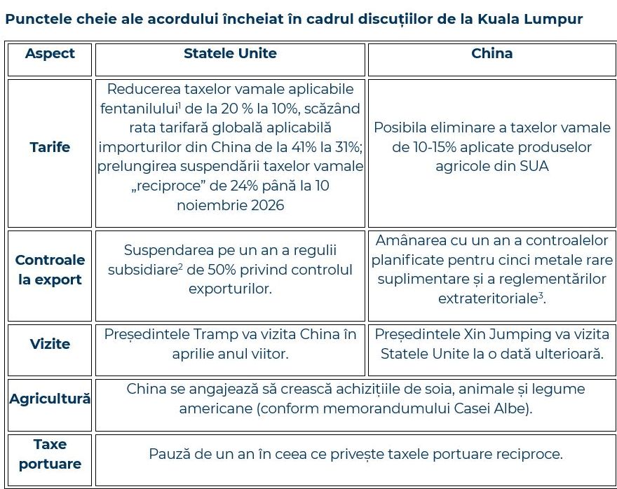In data de 30 octombrie, presedintii Xi Jinping si Donald Trump s-au intalnit pentru prima data din 2019, in contextul summitului APEC din Coreea de Sud. Cele doua puteri au ajuns la un acord tactic care permite Statelor Unite sa castige timp pentru a-si diversifica sursele de aprovizionare cu metale rare, iar Chinei sa gestioneze presiunile deflationiste si sa urmareasca autonomia tehnologica.Concesiile anuntate in cadrul acestui acord pot oferi o anumita pauza intreprinderilor comerciale globale. Cu toate acestea, acordul ramane fragil: mai multe dispute majore raman nerezolvate, in special in ceea ce priveste semiconductorii si pamanturile rare, iar fiecare parte pastreaza parghiile care ar putea reaprinde ostilitatile comerciale.