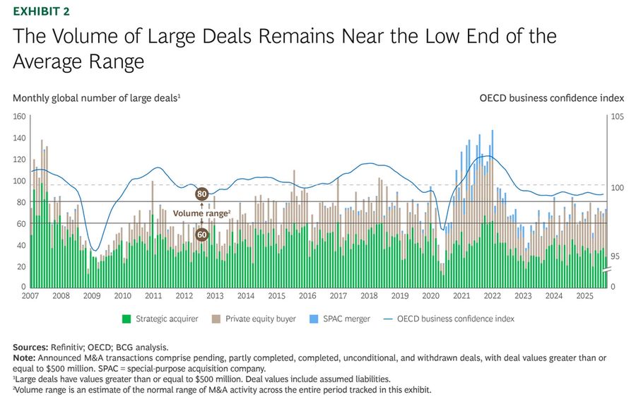 Tranzactiile de mari dimensiuni revin in forta: pana in prezent, in 2025 au fost anuntate 27 de megatranzactii (cu valori de peste 10 miliarde de dolari), fata de 21 anul trecut.