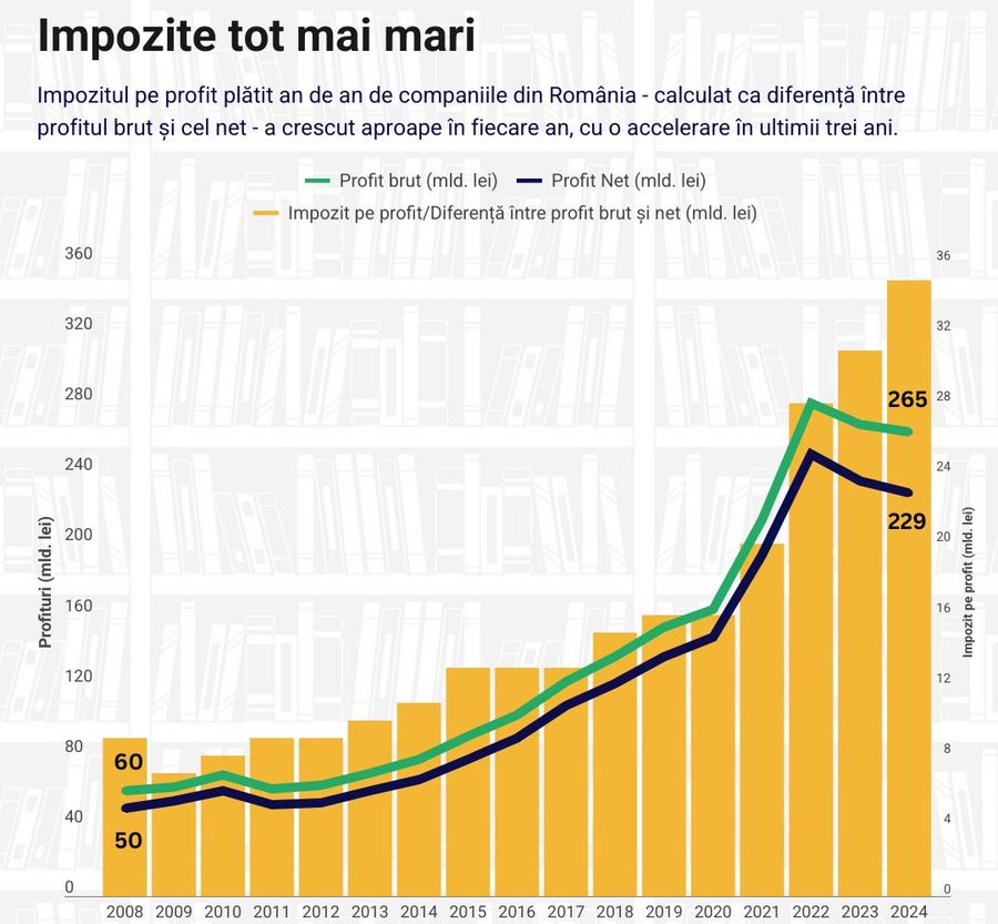 Profitul brut a crescut in perioada 2008-2024 de 4,4 ori, ajungand la 264,5 miliarde lei, iar profitul net a avansat de 4,5 ori, la 229,1 miliarde lei.