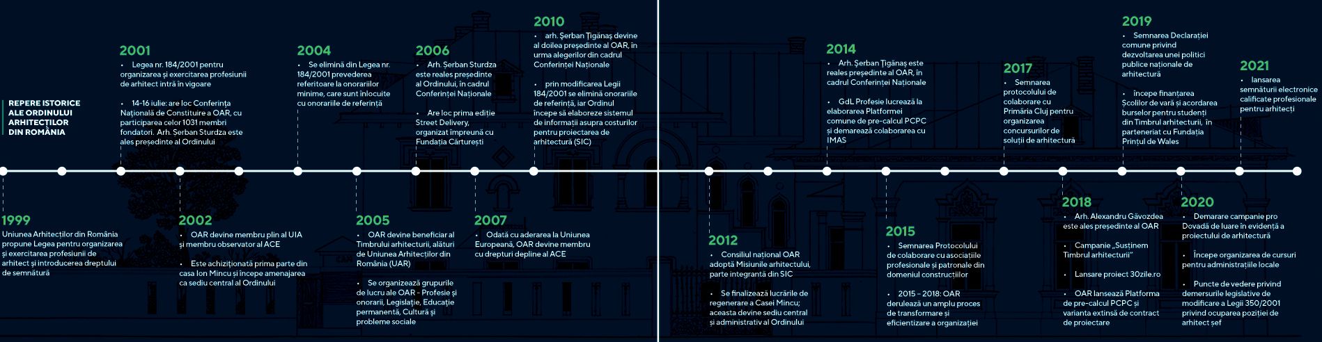 Lansarea SIC PCPC - Sistemul de informare asupra costurilor de proiectare de arhitectura. In 2010, ca urmare a modificarii Legii nr. 184/2001 s-au eliminat onorariile de referinta si OAR a fost obligat sa elaboreze sistemul de informatii asupra costurilor pentru proiectarea de arhitectura (SIC). In consecinta, in 2014 GdL Profesie OAR lucreaza la elaborarea platformei comune de precalcul (PCPC) si se semneaza colaborarea cu IMAS, care se concretizeaza, in 2018, prin lansarea primei variante a Platformei de pre-calcul. In perioada 2018-2021, continutul platformei a fost constant imbunatatit si completat, varianta finala urmand a fi lansata in curand. "Lansarea oficiala va aduce, cu siguranta, multa lumina in zona confuza a costurilor de proiectare si, mai ales, va sprijini orice manager public sau privat sa bugeteze adecvat proiectele de investitii, evitand capcana sub-bugetarii, care conduce inevitabil la reducerea calitatii in proiectare si executie deopotriva", precizeaza reprezentantii OAR.