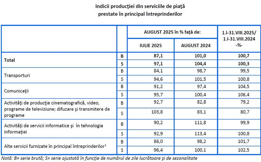 In luna august 2025 comparativ cu august 2024, cifra de afaceri din serviciile de piata prestate in principal intreprinderilor, serie bruta, a crescut, pe ansamblu, cu 1%, datorita majorarii rulajului din activitatile de servicii informatice si in tehnologia informatiei (+11,8%). Scaderi au inregistrat activitatile de productie cinematografica, video, programe de televiziune; difuzare si transmitere de programe (-17,2%), activitatile de comunicatii (-2,6%), alte servicii furnizate in principal intreprinderilor1 (-1,8%) si activitatile de transporturi (-1,3%). Ca serie ajustata, cifra de afaceri din serviciile de piata prestate in principal intreprinderilor a crescut, in aceeasi perioada de raportare, pe ansamblu, cu 4,4%.