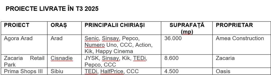Zacaria Retail Park Cisnadie (8.600 metri patrati) si a treia faza a Prima Shops Sibiu (4.500 metri patrati) au fost de asemenea finalizate in T3 2025.