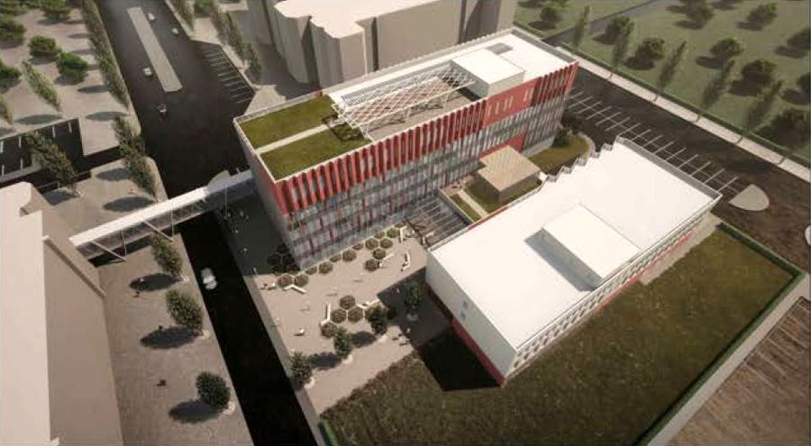 Cladirea nou-propusa va fi amplasata in spatiul dintre cele doua corpuri existente pe teren, intre latura de sud-vest a corpului C1 si corpul C6, creandu-se posibilitatea conectarii corpurilor existente cu noua cladire. Se propune, astfel, realizarea unei pasarele de legatura intre Tronsonul 1 al imobilului nou si Corpul C1 existent, care va conecta cele doua cladiri la nivelul primului etaj. Se vor executa lucrari de desfacere a parapetului din zidarie si a tamplariei existente in zona de capat a pasarelei si de conectare a celor doua imobile.