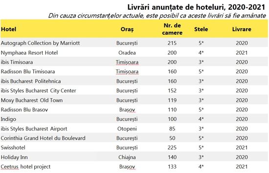 "Avand in vedere contextul actual, este foarte probabil ca livrarile si planurile de dezvoltare pentru piata hoteliera sa fie intarziate sau amanate. Intrucat industria turistica este cea mai afectata de pandemia Covid-19, in 2020 se asteapta o scadere importanta a numarului de turisti, in special a celor straini. Chiar daca restrictiile de calatorie vor fi ridicate, calatoriile internationale este posibil sa fie limitate la cele de afaceri. Intr-un scenariu optimist, preconizam ca turismul intern are o sansa de redresare in ultimul trimestru al anului - inceputul anului 2021. Incepand cu 2021, am putea observa revenirea pietei la ritmul sau de crestere, cel mai probabil sustinut mai mult de segmentul de afaceri si mai putin de segmentul de agrement", arata analistii Crosspoint.