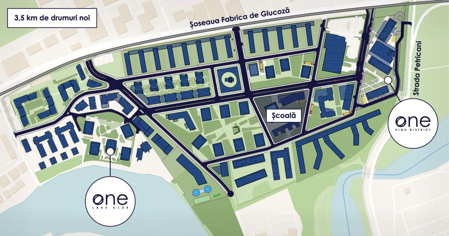 In plus, One United Properties a investit si in infrastructura acestei zone, cu scopul de a sprijini mobilitatea si a facilita un trai de calitate pentru viitoarele comunitati. Astfel, o investitie de 6 milioane de euro, realizata de companie impreuna cu alti dezvoltatori imobiliari prezenti in aceasta zona, a fost destinata construirii a 3,5 kilometri de drumuri noi, cu finalizare estimata pentru sfarsitul acestui an. Acestea includ ramificatii care vor conecta dezvoltarile din zona Fabrica de Glucoza si viitoarea unitate de invatamant. Toate lucrarile sunt realizate conform avizelor CTC si Brigazii Rutiere, iar noile strazi vizeaza reducerea presiunii asupra traficului de pe Sos. Fabrica de Glucoza, prin redistribuirea catre artere secundare si acces direct inspre Sos. Petricani, precum si cresterea accesibilitatii catre proiectele rezidentiale si unitatea educationala.