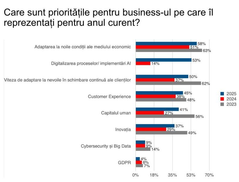 Transformarea digitala a devenit o prioritate strategica. Conform studiului, 53% dintre companii vizeaza integrarea inteligentei artificiale si digitalizarea proceselor, in timp ce 58% plaseaza adaptarea la noile conditii economice in centrul strategiei lor.